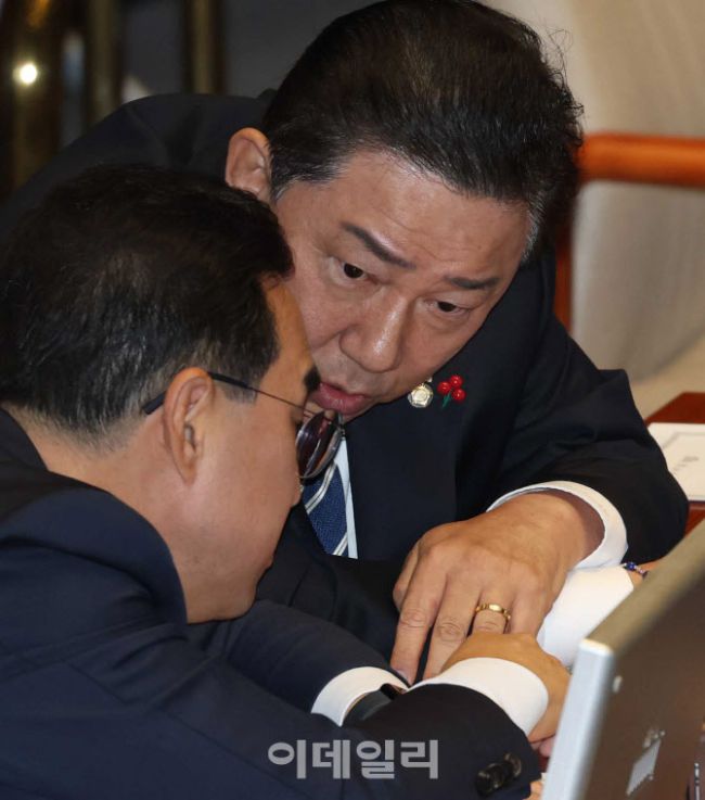 김병기 더불어민주당 원내대표와 박홍근 의원이 22일 서울 여의도 국회에서 열린 제430회국회(임시회) 제2차 본회의에서 대화하고 있다.