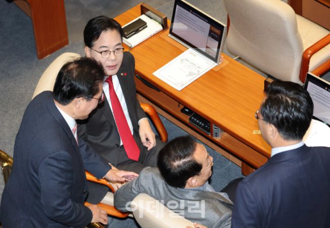 송언석 국민의힘 원내대표와 김도읍 정책위의장 등이 23일 서울 여의도 국회에서 열린 제430회국회(임시회) 제2차 본회의에서 대화하고 있다.