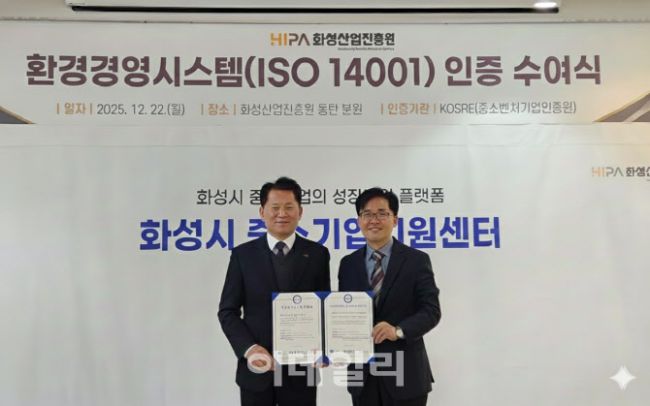 엄진엽(왼쪽) 중소벤처기업인증원장과 전병선 화성산업진흥원장이 화성산업진흥원 동탄 분원에서 열린 ISO14001(환경경영시스템) 인증식에서 기념촬영을 하고 있다. 전병선 화성산업진흥원장은 “이번 ISO 14001 인증은 기존 ESG 경영체계를 환경 분야까지 확장한 의미 있는 성과”라며, “앞으로도 공공기관으로서 사회적 책임을 다하고 지역사회와 기업이 신뢰할