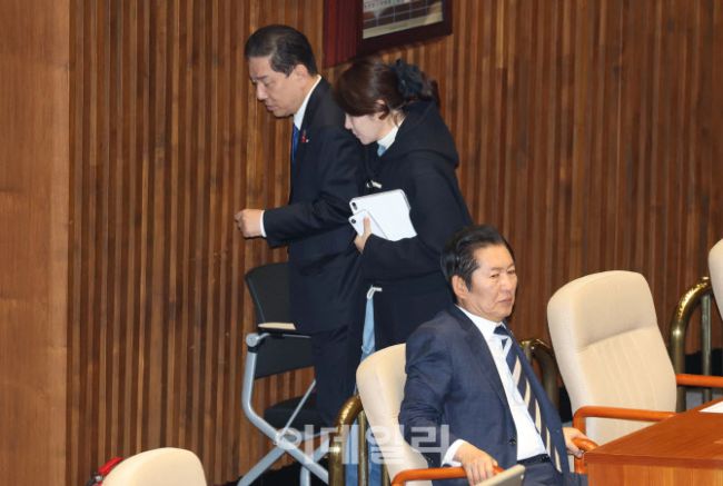 지난 24일 서울 여의도 국회에서 열린 제430회국회(임시회) 제2차 본회의에서 김병기 더불어민주당 원내대표와 강선우 의원이 본회의장을 나가고 있다. 오른쪽은 정청래 더불어민주당 대표.