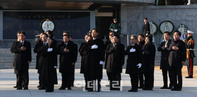 오세훈 서울시장과 구청장들이 새해 첫날인 1일 서울 동작구 국립서울현충원에서 현충탑에 참배하고 있다.