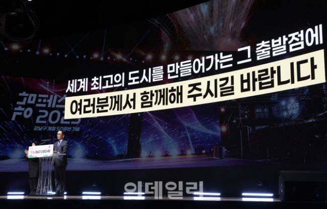 조성명 강남구청장이 8일 코엑스 오디토리움에서 열린 2026년 신년인사회에서 인사말을 하고 있다. 조성명 구청장은 “세계 최초의 주민 주도형 10분 도시계획을 시작한다”고 밝혔다. 이에 따른 30개 지하철역을 거점으로 한 역세권 고밀복합개발과 보행 중심 공간 개편에 대해 소개했다. (사진=강남구)