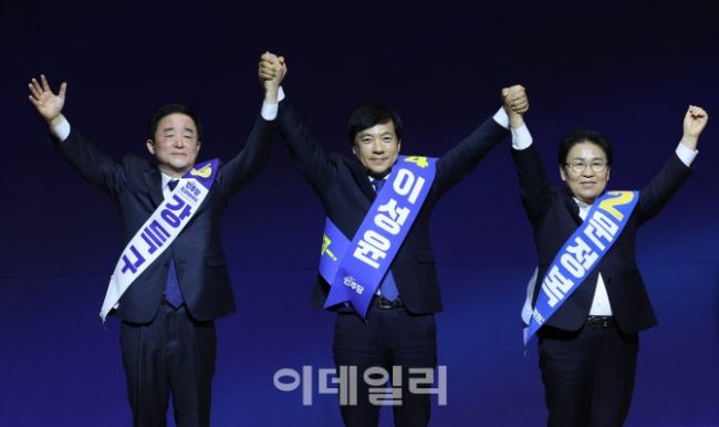 11일 서울 여의도 국회 의원회관에서 더불어민주당 최고위원 보궐선거 후보자 합동연설회가 열렸다. 최고위원에 당선된 강득구(왼쪽부터), 이성윤, 문정복 더불어민주당 의원이 손을 들어 인사하고 있다.