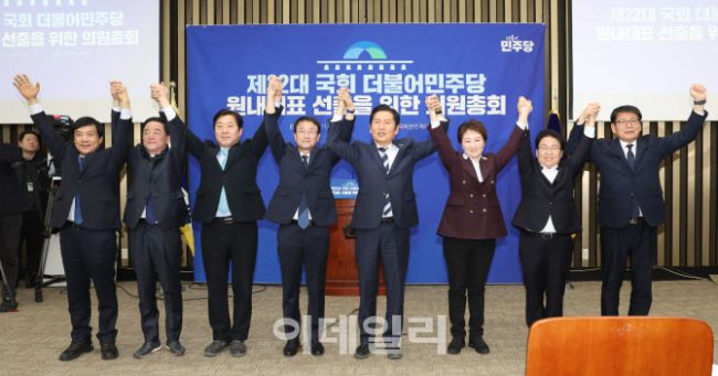 11일 서울 여의도 국회에서 제22대 국회 더불어민주당 제2기 원내대표 선출 의원총회가 열렸다. 정청래 더불어민주당 대표와 한병도 신임 원내대표, 최고위원들이 손을 들어 의원들에게 인사하고 있다.