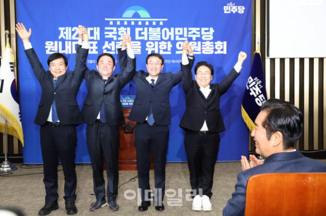 11일 서울 여의도 국회에서 제22대 국회 더불어민주당 제2기 원내대표 선출 의원총회가 열렸다. 한병도(왼쪽 세번째) 신임 원내대표와 이성윤, 강득구, 문정복 신임 최고위원이 손을 들어 의원들에게 인사하고 있다.