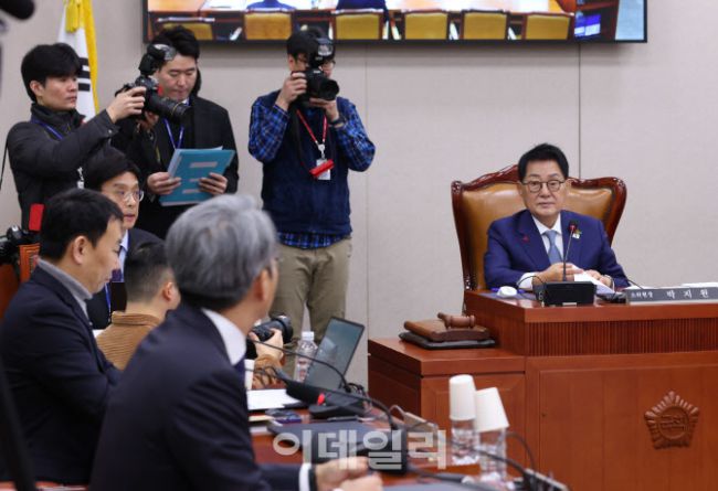 12일 서울 여의도 국회에서 열린 법제사법위원회 안건조정위원회에서 박지원 소위원장이 회의를 주재하고 있다.