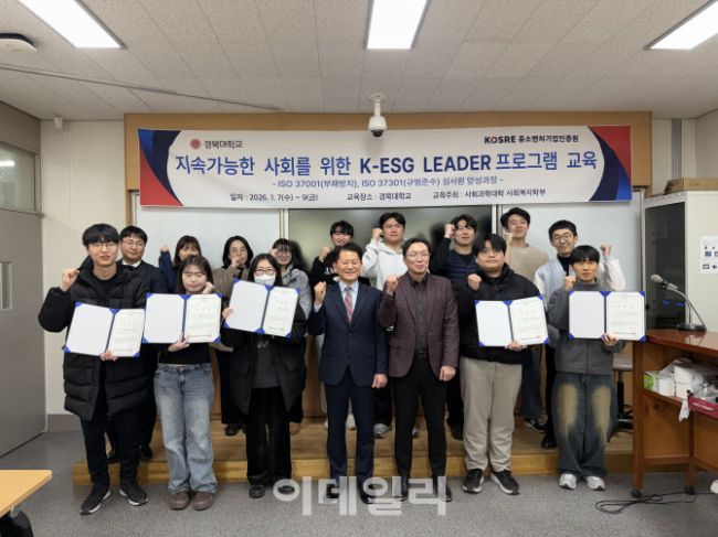 ‘지속가능한 사회를 위한 K-ESG LEADER 프로그램’ 교육 수료식에서 중소벤처기업인증원 엄진엽 원장, 경북대학교 신창환 사회복지학부 교수, 관계자 및 교육생들이 기념촬영을 하고 있다. 1월 7일부터 9일까지 사흘간 열린 이번 교육은 전 세계적으로 ESG 경영의 중요성이 강조되고 있는 가운데 ESG의 주요 지표 중 하나인 투명경영(G) 분야에 대한 경북