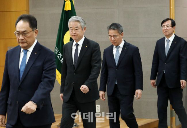 강호동(왼쪽 두번째) 농협중앙회장이 13일 농협 본관에서 기자회견을 갖고 농림축산식품부 특별감사 발표와 관련 대국민 사과와 함께, 조직 전반에 대한 쇄신 및 제도개선 방안을 발표하고 있다. 강 회장은 사과문에서 “책임을 통감하며 농협의 존재 이유와 역할을 바로 세우는 출발점으로 삼겠다”고 말했다. 농협중앙회는 중앙회장의 권한과 역할을 명확히 하고, 관례에