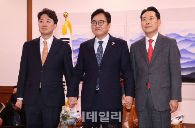 우원식 국회의장이 13일 오후 서울 여의도 국회에서 의장실을 방문한 장동혁 국민의힘 대표, 이준석 개혁신당 대표와 기념촬영을 하고 있다.