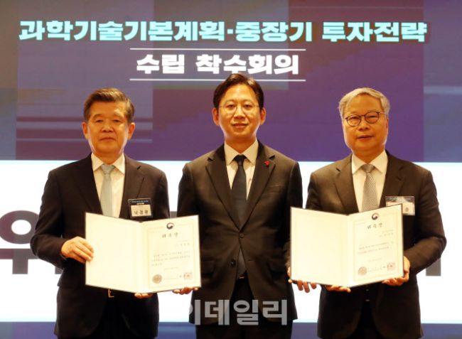 배경훈(가운데) 부총리 겸 과기정통부 장관이 20일 서울 중구 코리아나호텔에서 열린 ‘제6차 과학기술기본계획’ 및 ‘제2차 국가연구개발 중장기 투자전략’ 수립 착수회의에서 투자전략 총괄위원장 윤의준(오른쪽) 한국공학한림원 회장, 과학기술기본계획 총괄위원장 나경환(왼쪽) 단국대학교 석좌교수에게 위촉장을 전달하고 있다. 과기정통부는 이날 기본계획 및 투자전략