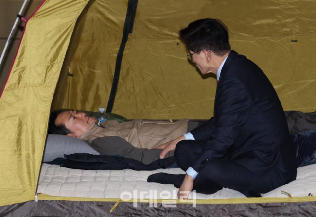 통일교 및 공천헌금 특검 수용을 촉구하며 7일째 단식을 이어가고 있는 장동혁 국민의힘 대표가 21일 서울 여의도 국회 로텐더홀에 마련된 농성장을 찾은 김문수 전 고용노동부 장관과 대화하고 있다.
