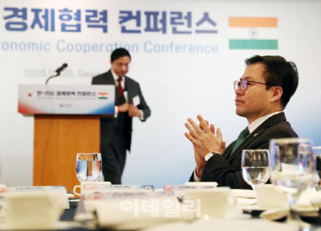 여한구 통상교섭본부장이 20일 ‘롯데호텔 서울’에서 열린 ‘한-인도 경제협력 컨퍼런스’에 참석하고 있다. 한-인도 컨퍼런스는 ‘인도 비즈니스 이해증진’ 주제발표와 ‘공동번영을 위한 한-인도 전략적 협력 강화 방안’ 패널 토의 등이 진행됐다.