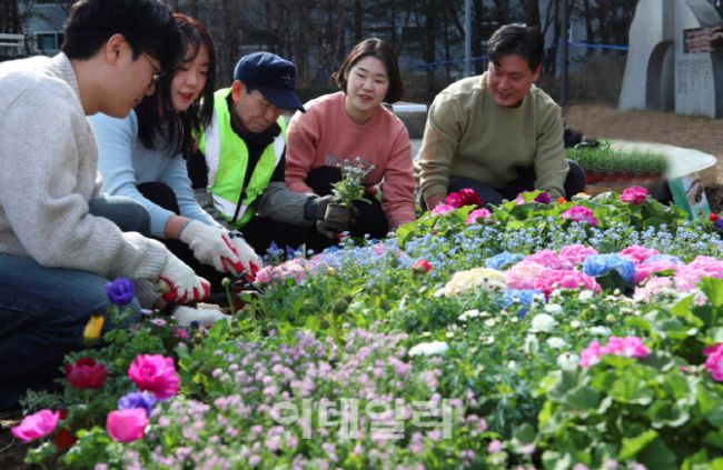 성동구청(구청장 정원오) 관계자들이 26일 왕십리 광장에 새봄맞이 화단을 조성하고 있다. 이날 식재된 봄꽃은 데이지, 아네모네 등 봄을 알리는 봄꽃 8종 1,500여 본이다. 성동구는 거리 곳곳에 가로 정원을 조성해 주민들에게 봄의 따스한 기운을 전할 예정이다. (사진=성동구)
