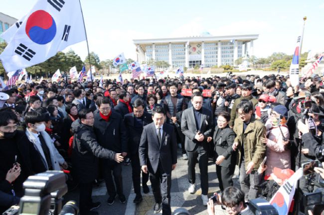 장동혁 국민의힘 대표와 송언석 원내대표를 비롯한 지도부가 3일 서울 여의도 국회 본관 앞에서 열린 사법독립 헌정수호를 위한 대국민 호소 국민대장정 규탄대회를 마친 뒤, 청와대를 향해 행진하고 있다. 장동혁 국민의힘 대표와 송언석 원내대표를 비롯한 지도부가 3일 서울 여의도 국회 본관 앞에서 열린 사법독립 헌정수호를 위한 대국민 호소 국민대장정 규탄대회를 마
