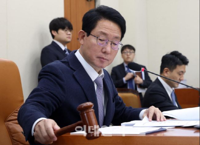 김상훈 위원장이 4일 서울 여의도 국회에서 열린 대미투자특별법 처리를 위한 특별위원회 전체회의에서 안건을 상정하며 의사봉을 두드리고 있다.