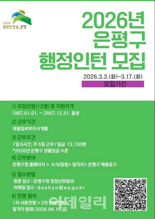 은평구(구청장 김미경)는 미취업 청년을 대상으로 행정인턴 참여자 12명을 오는 17일까지 모집한다. 이번 행정인턴 프로그램은 구정 전반에 대한 실무 경험을 통해 청년들이 행정 현장을 직접 체험하고, 정책 수립과 집행 과정을 이해하도록 마련됐다. 참여자는 여러 부서에 배치돼 행정 지원, 자료 조사, 민원 업무 보조 등 다양한 실무를 수행하게 된다. 모집 대상