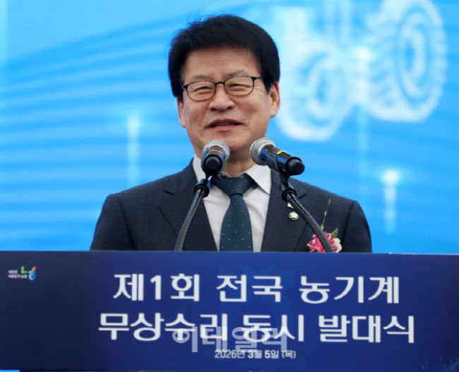 임호선 더불어민주당 의원이 5일 충북 음성군 생극농협 농기계센터에서 열린 ‘제1회 전국 농기계 무상수리 동시 발대식’에서 인사말을 하고 있다. ‘농협 농기계 무상수리 발대식’에는 전국 10개 시도의 수리 현장을 실시간으로 연결한 발대식과 무상수리 개시 점등식을 통해 전국 단위 통합 영농지원 체계를 본격 가동했다. 이날 강호동 농협중앙회장 등 참석자들은 ▲