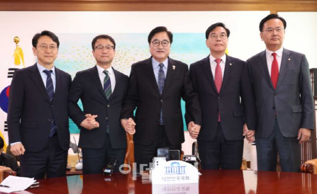 우원식 국회의장과 한병도 더불어민주당 원내대표, 송언석 국민흼힘 원내대표가 12일 오전 서울 여의도 국회에서 열린 여야 원내대표 회동에 참석해 기념촬영을 하고 있다. 왼쪽부터 천준호 더불어민주당 원내운영수석부대표, 한병도 원내대표, 우 국회의장, 송언석 국민의힘 원내대표, 유상범 원내운영수석부대표.