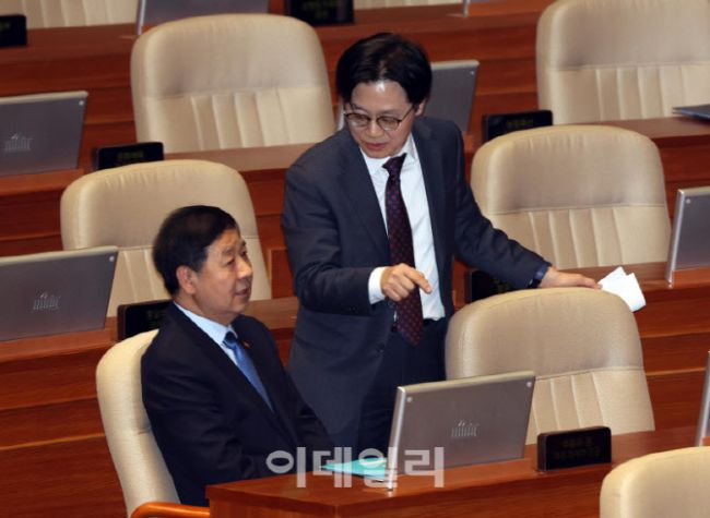 [포토]본회의, '대화하는 구윤철-김정관'