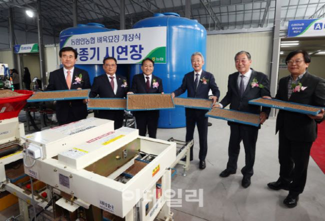 강호동(오른쪽 세 번째) 농협중앙회장이 16일 동함안농업협동조합(조합장 신대운) 벼육묘장 개장식에서 자동화 설비 현장을 둘러보며 육묘 생산 공정을 점검하고 있다. 동함안농협 벼 육묘장은 5,000평 규모로, 자동화 육묘장 889평과 경화장 3,414평으로 조성됐다. 농업인구 감소와 일손 부족, 농촌 고령화 등으로 어려움을 겪는 농가에 현대화·자동화 시설을