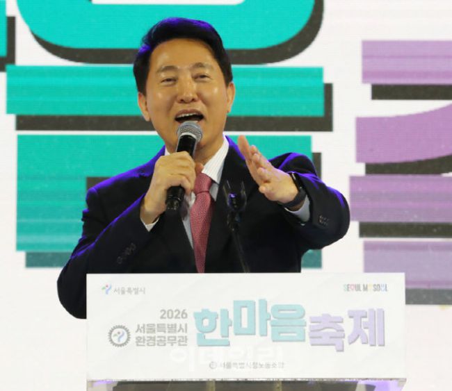오세훈 서울시장이 19일 서울 송파구 잠실 학생체육관에서 열린 서울시 환경공무관 한마음축제에 참석해 인사말을 하고 있다. 이날 한마음축제에는 정청래 더불어민주당 대표, 김근식 서울교육감, 최호정 서울시의회 의장과 정원오 서울시장 후보 예정자, 구청장 후보자 등이 참석했다.