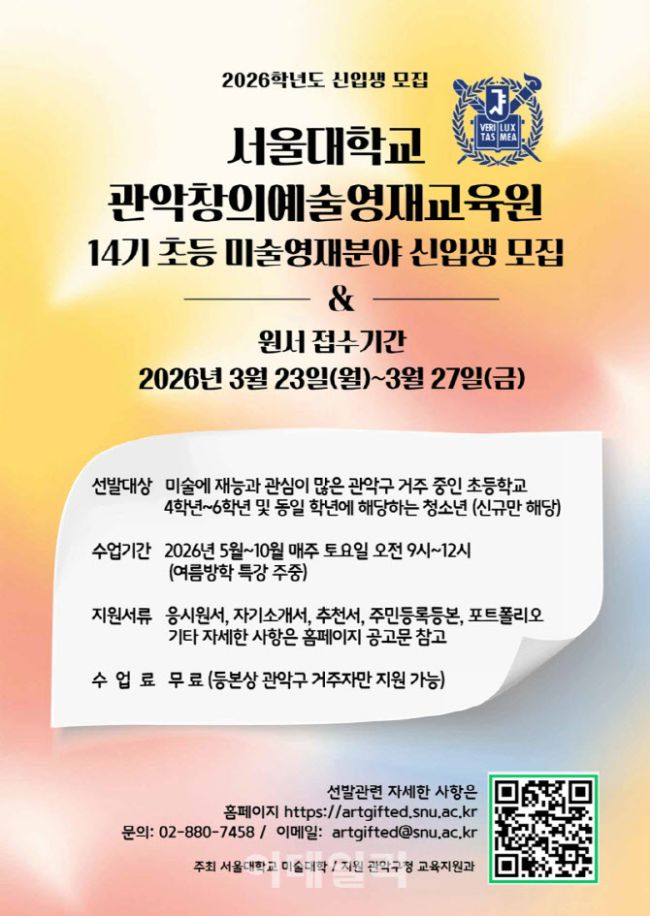 관악구(구청장 박준희)가 서울대학교 미술대학과 함께 학·관 협력 사업의 일환으로 운영하는 ‘관악창의예술영재교육원’의 제14기 신입생을 모집한다고 22일 밝혔다. 2013년부터 총 614명의 수료생(사회적배려대상자 포함)을 배출한 ‘관악창의예술영재교육원’은 미술에 대한 재능과 잠재력을 가진 학생을 발굴하고 차세대 미래예술인재로 양성하기 위해 관악구와 서울대