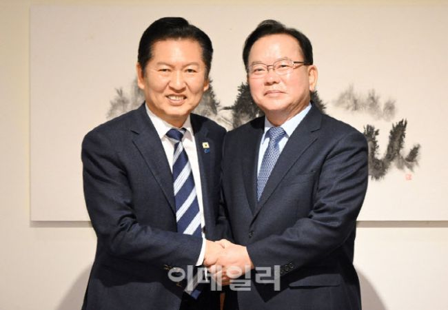 [국회사진기자단] 정청래 더불어민주당 대표와 김부겸 전 국무총리가 26일 서울 중구 달개비에서 회동 전 손을 맞잡고 있다.