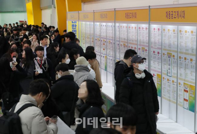 19일 서울 서초구 aT센터에서 열린 2025 대한민국 채용박람회에서 참가자들이 채용공고 게시대를 살펴보고 있다. 채용박람회는 19일, 20일 양일간 제1전시장에서 개최된다
