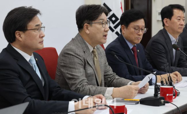 권성동 국민의힘 원내대표가 19일 오후 서울 여의도 국회에서 열린 기자간담회에서 발언하고 있다.