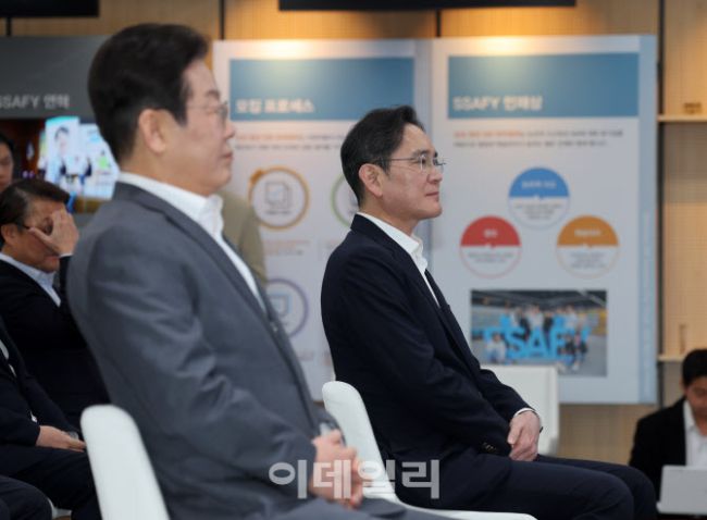 이재명 더불어민주당 대표와 이재용 삼성전자 회장이 20일 오전 서울 강남구 사피(SSAFY·삼성청년소프트웨어)아카데미에서 사피 관련 영상을 시청하고 있다.