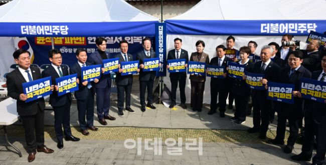 이재명 더불어민주당 대표와 박찬대 원내대표 및 지도부가 24일 오전 서울 광화문 앞 민주당 천막당사에서 열린 최고위원회의에 앞서 현판식을 갖고 구호를 외치고 있다.