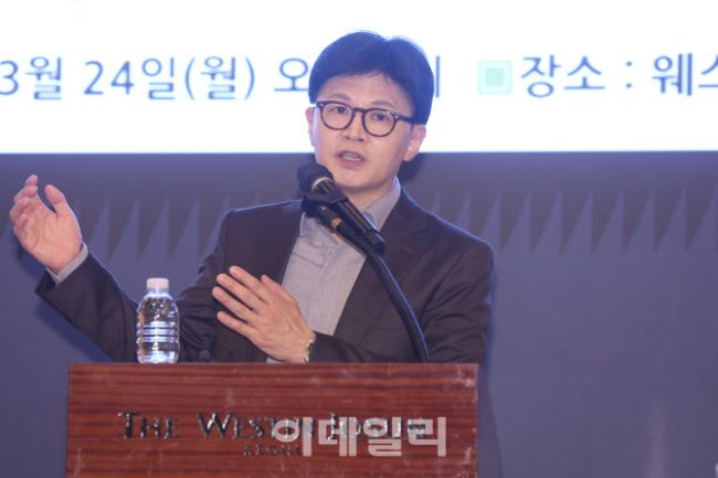 한동훈 국민의힘 전 대표가 24일 서울 중구 웨스틴조선호텔에서 열린 산학연 포럼에 참석해 강연을 하고 있다.