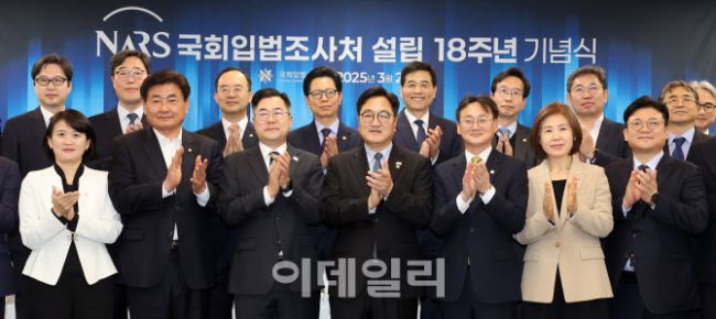 우원식 국회의장과 이관후 국회입법조사처장, 박찬대 더불어민주당 원내대표를 비롯한 참석자들이 25일 오후 서울 여의도 국회입법조사처 대회의실에서 열린 국회입법조사처 설립 18주년 기념식에서 기념촬영을 하고 있다.