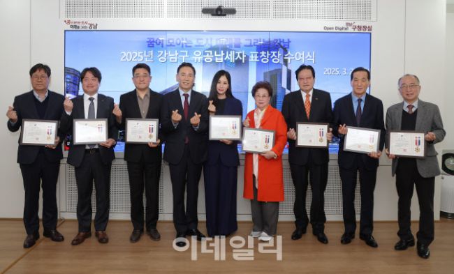 조성명(왼쪽 네번째)강남구청장이 27일 '2025 유공납세자 표창장 수여식'에서 배우 고소영(다섯번째)을 포함한 성실납세자 10명에게 표창장을 수여했다. 고소영 씨는 강남구에 거주하며 오랜 기간 성실하게 지방세를 납부해 왔으며 평소에도 자녀들과 나무 심기, 연탄배달 등 지역사회와 소외계층을 위한 다양한 사회공헌 활동을 적극 펼쳐왔다. 고 씨는 “성실하게 세
