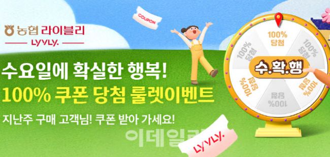 농협 경제지주(축산경제대표이사 안병우)가 운영하는 축산물 전문 온라인 쇼핑몰 농협 라이블리에서 매주 수요일마다 '수요일에 확실한 행복(수확행)' 이벤트를 진행한다고 1일 밝혔다. 농협 라이블리는 직장인들이 가장 많은 스트레스와 피로를 느낀다는 수요일에, 수요병 스트레스 해소를 돕고자 룰렛을 돌려 100% 당첨방식으로 운영되는 이벤트를 시작했다. 매주 수요일