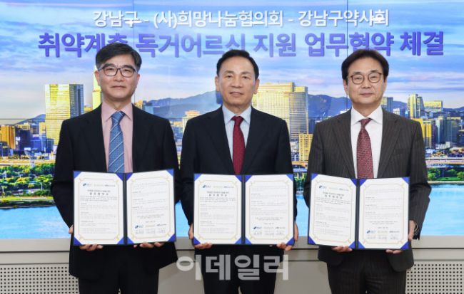조성명(가운데) 강남구청장이 2일 강남구청에서 (사)희망나눔협의회(상임대표 원희목), 강남구약사회(회장 김형지)와 함께 취약계층 독거어르신 지원 강화를 위한 3자 업무협약을 체결했다. 강남구는 일상생활이 어려운 독거어르신을 위해 강남구노인통합지원센터를 통해 ‘노인맞춤돌봄서비스’를 운영하고 있다. AI 돌봄기기를 활용한 안전·안부 확인을 비롯해 사회참여 프로