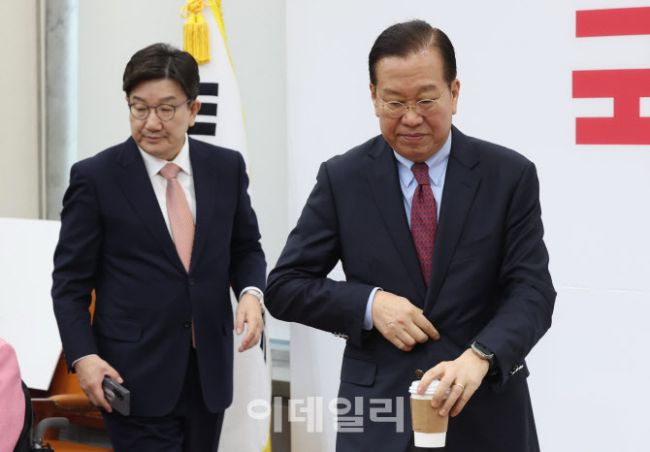 권영세 국민의힘 비상대책위원장과 권성동 원내대표가 3일 오전 서울 여의도 국회에서 열린 비상대책위원회의에 참석하고 있다.