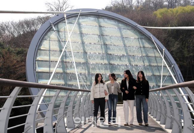 3일 서초구가 봄을 맞아 가동을 재개한 서울 서초구 아쿠아아트 육교 워터스크린 앞을 시민들이 걷고 있다. 서초구는 출·퇴근시간 점심시간 등에 시간대별로 가동하며 폭염주의보 및 미세먼지 농도 나쁨 시에는 상시 운영한다.