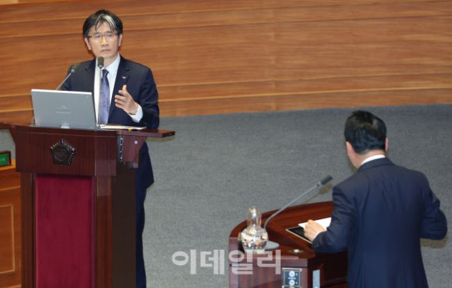3일 서울 여의도 국회에서 제423회 국회(임시회) 제4차 본회의가 열렸다. ‘경북·경남·울산지역 산불 사태 수습과 피해대책 마련 및 헌법질서 수호를 위한 긴급현안질문’에서 오동운 고위공직자범죄수사처장이 장동혁 국민의힘 의원의 질의에 답변하고 있다.