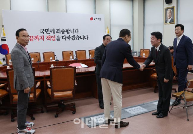 권영세 국민의힘 비상대책위원장과 안철수 의원이 6일 오후 서울 여의도 국회에서 4선 이상 중진 의원들과의 간담회에 참석, 악수하고 있다.