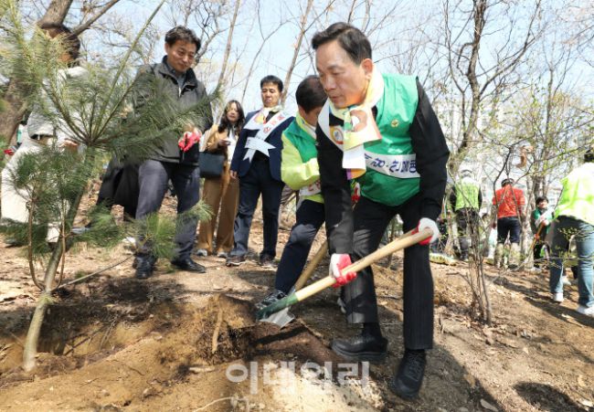 조성명 강남구청장이 제80회 식목일을 맞아 7일 도곡근린공원 매봉산 일대에서 나무를 심고 있다. 이번 행사는 강남구새마을회(회장 이종선) 주관으로 열렸으며, 윤상태 새마을협의회장, 박조연 새마을부녀회장 등 새마을회 임원과 회원, 내빈, 구청 직원 등 250여 명이 참여했다. 참가자들은 도곡근린공원 원형광장 인근 등산로 약 300m 구간에 사철나무와 스트로브