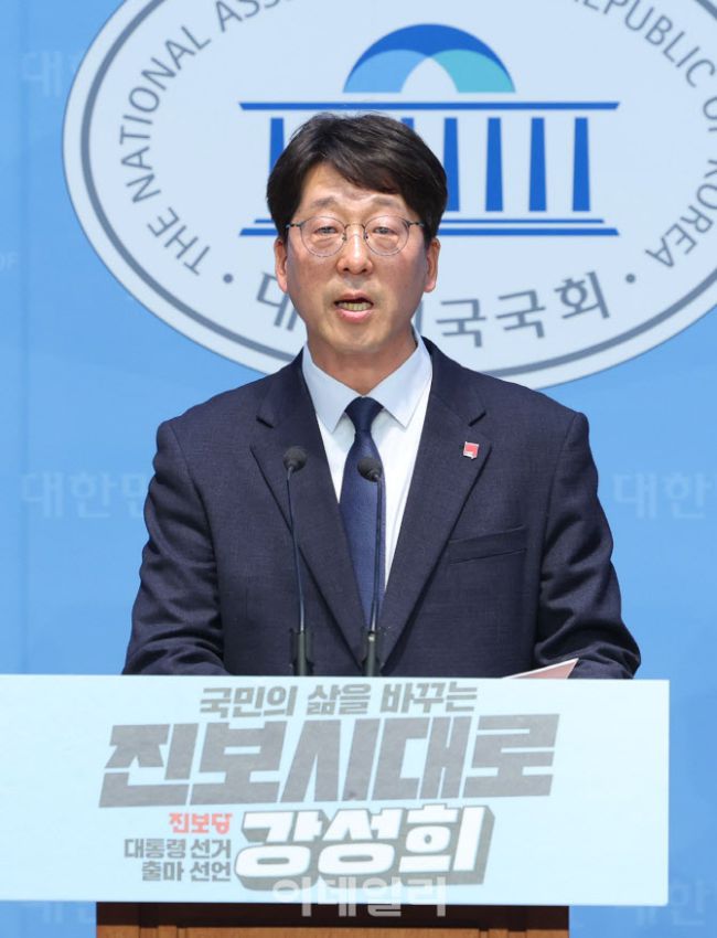 강성희 전 진보당 의원이 8일 오전 서울 여의도 국회 소통관에서 제21대 대통령선거 출마선언 기자회견을 하고 있다.