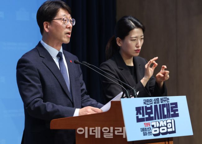 강성희 전 진보당 의원이 8일 오전 서울 여의도 국회 소통관에서 제21대 대통령선거 출마 선언 기자회견을 하고 있다.