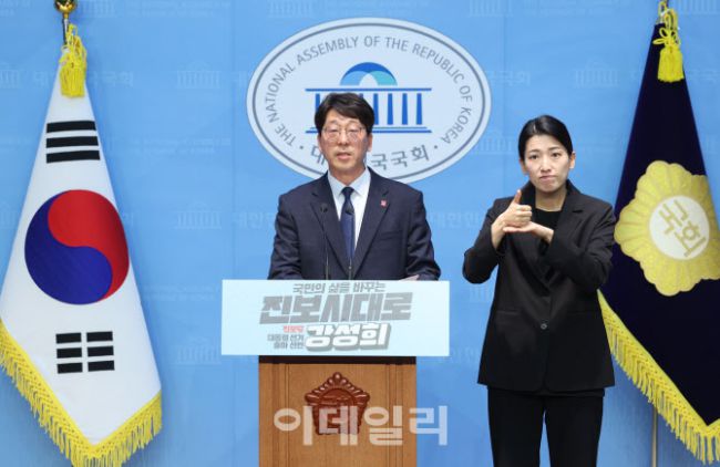 강성희 전 진보당 의원이 8일 오전 서울 여의도 국회 소통관에서 제21대 대통령선거 출마 선언 기자회견을 하고 있다.