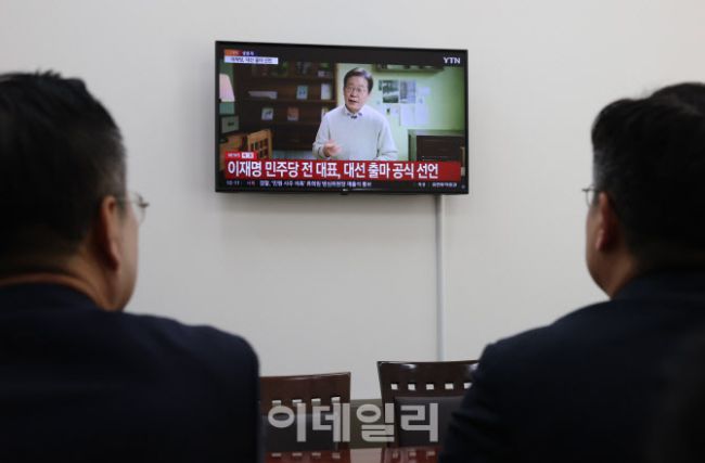 이재명 더불어민주당 전 대표가 10일 영상을 통해 제21대 대통령선거 출마를 공식 선언했다. 이날 오전 서울 여의도 국회에서 박찬대 당대표 직무대행 겸 원내대표와 박성준 원내수석부대표가 방송을 지켜보고 있다.
