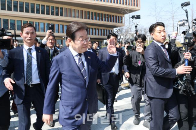 제21대 대통령 선거(대선) 출마를 선언한 이재명 더불어민주당 전 대표가 11일 오전 서울 여의도 국회 소통관 기자회견장에서 비전 선포 기자회견을 마친 뒤, 소통관을 나서며 지지자들에게 인사를 하고 있다.