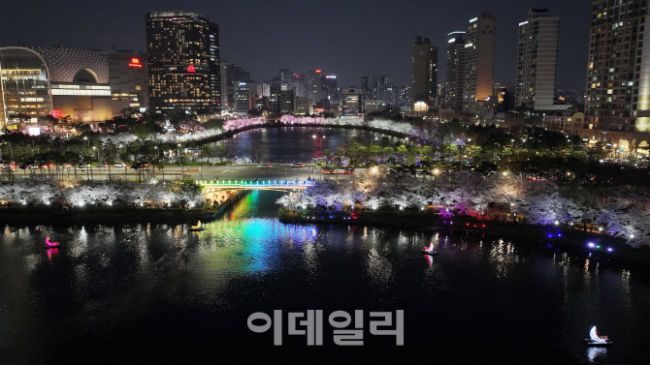 벚꽃이 만개한 10일 서울 송파구 석촌호수에서 시민들이 화려한 야간 조명과 함께 봄을 즐기고 있다. 석촌호수가 자리한 서울 송파구는 전국에서 찾는 벚꽃 명소로 매해 벚꽃 축제 시기에 수백만명에 달하는 상춘객으로 붐빈다. (사진=송파구)