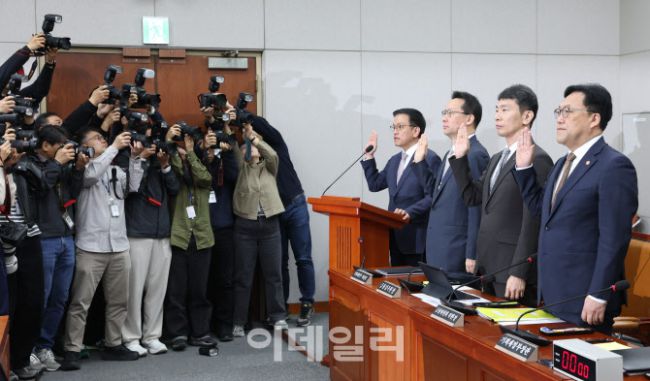 최상목(오른쪽 네번째) 경제부총리 겸 기획재정부 장관 및 증인들이 16일 오전 서울 여의도 국회에서 열린 '법제사법위원회 최 부총리 탄핵소추사건 조사 청문회'에서 증인 선서를 하고 있다.