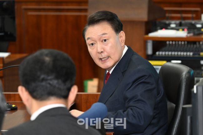 윤석열 전 대통령이 21일 서울 서초동 서울중앙지법에서 열린 내란 우두머리 혐의 형사재판 2번째 공판에 출석하고 있다.