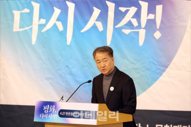 박능후 포럼 사의재 상임대표가 25일 오후 서울 여의도 국회 도서관 대강당에서 열린 '평화, 다시 시작!' 4.27 판문점선언 7주년 기념식에서 개회사를 하고 있다.